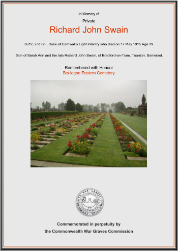 The recent casualty lists announce the death of Private R J Swain (8612) of the 2nd Duke of Cornwall’s Light Infantry, who formerly lived at Stoke St Mary, and whose mother now resides at Three Bridges, Bradford [on Tone].