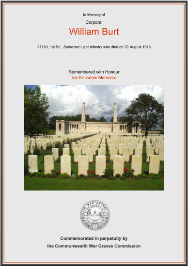 William Burt had a first cousin, also called William. His full name was William Charles Burt and he was born in West Hatch/Thornfalcon