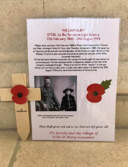 William Burt was born in West Hatch on 17 Feb 1880 and baptized at St Andrews Church on 18 Apr 1880. He was the eldest boy of seven children, Georgina, William, Hannah, Thomas, George, Sarah Ann, and Florence. The first three, Georgina, William and Hannah were born in West Hatch and the rest were born and baptized in Stoke St Mary. They were living in Stoke from approximately 1885.