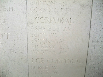 Corporal William Burt’s name as it appears on the back wall of the cemetry at Vis en Artois.