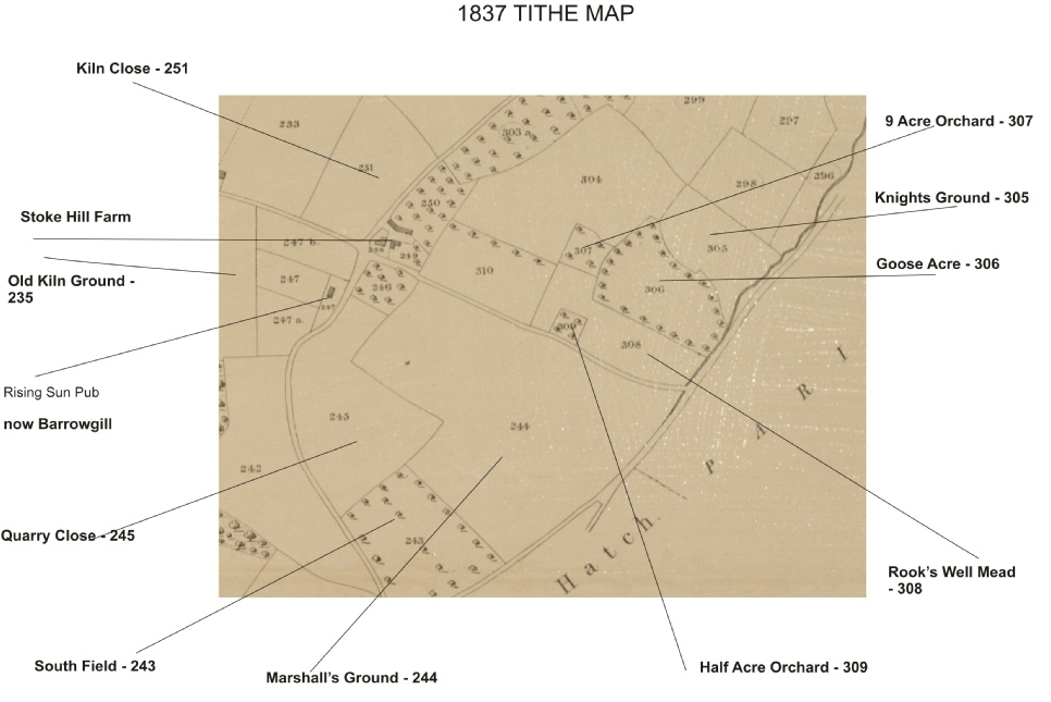 According to the 1837 Tithe Map the land around the lime kiln was owned by Amelia Murless and Edward Prior. The nine acre orchard and Rook’s Well mead were farmed by Charles Dawe.