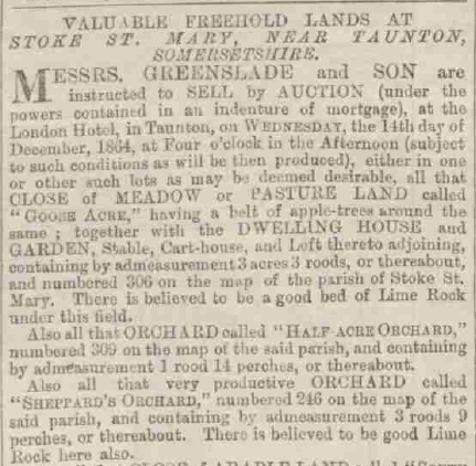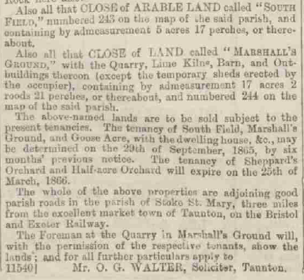 The fields and lime kilns were then owned by Samuel Stodgell, owner of Stoke Castle. He is recorded as providing lime to the Church in Stoke St Mary when there was building work being done. Samuel Stodgell died in 1872 and left his estate to his sister, married to Samuel Tapp. Their daughter was married to Wareham Hull and so some of the land passed into his hands. Though it rather looks as if the lime kiln then was in Marshalls Field. The land was bought by Aaron Small from Stoke St Mary, father of George Small.